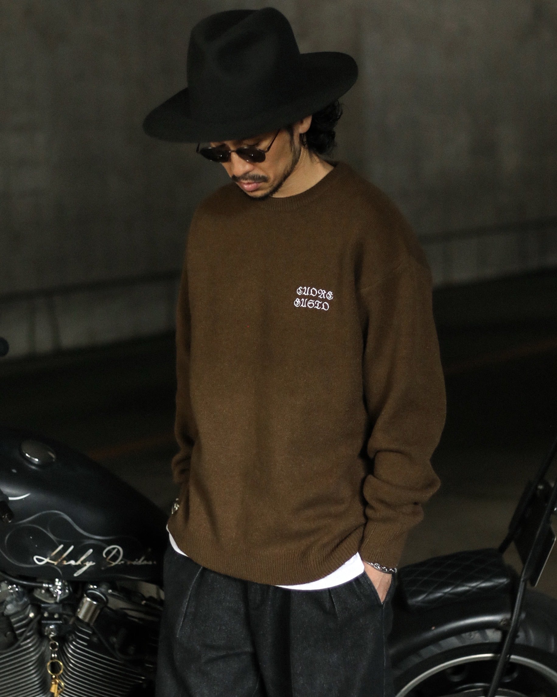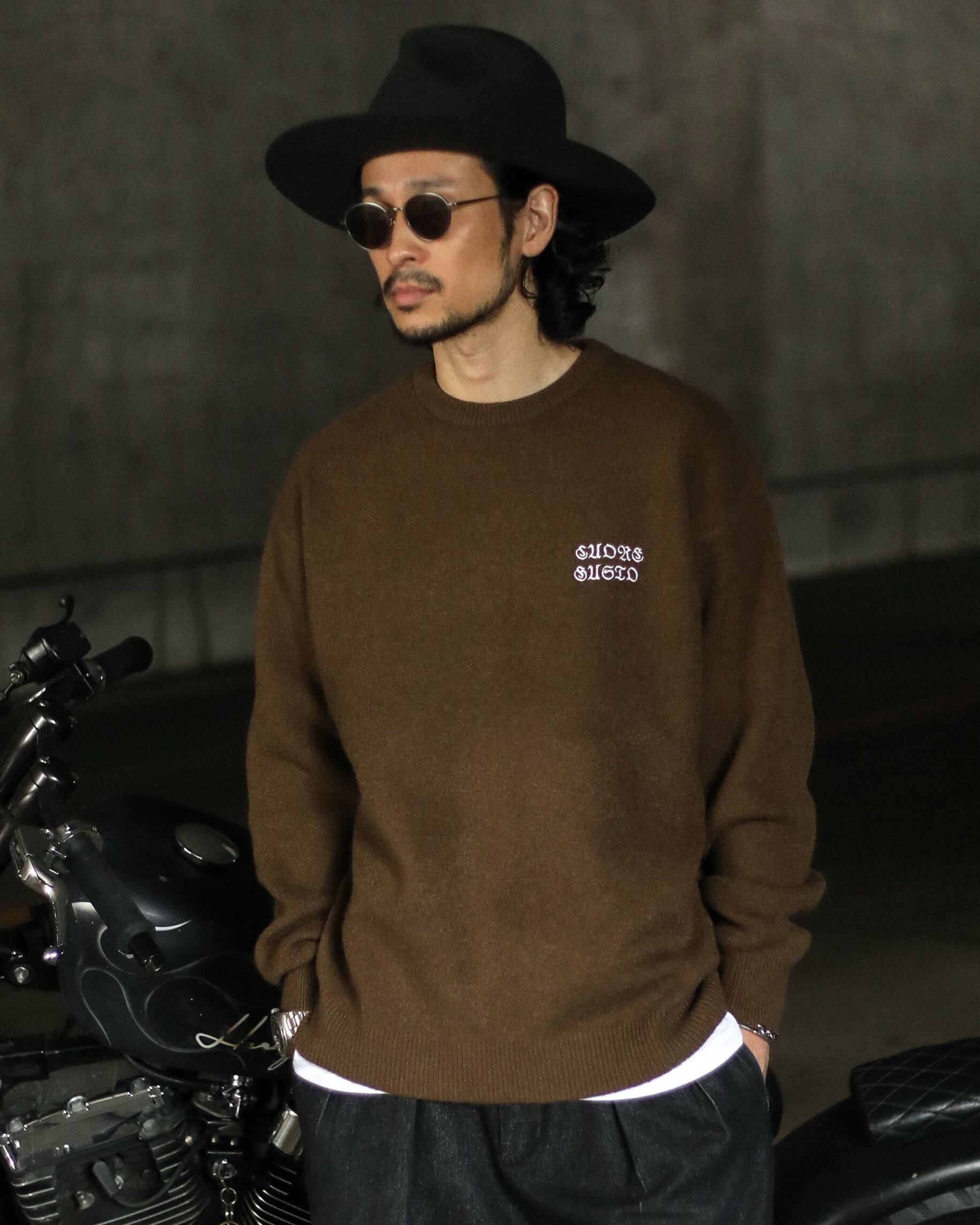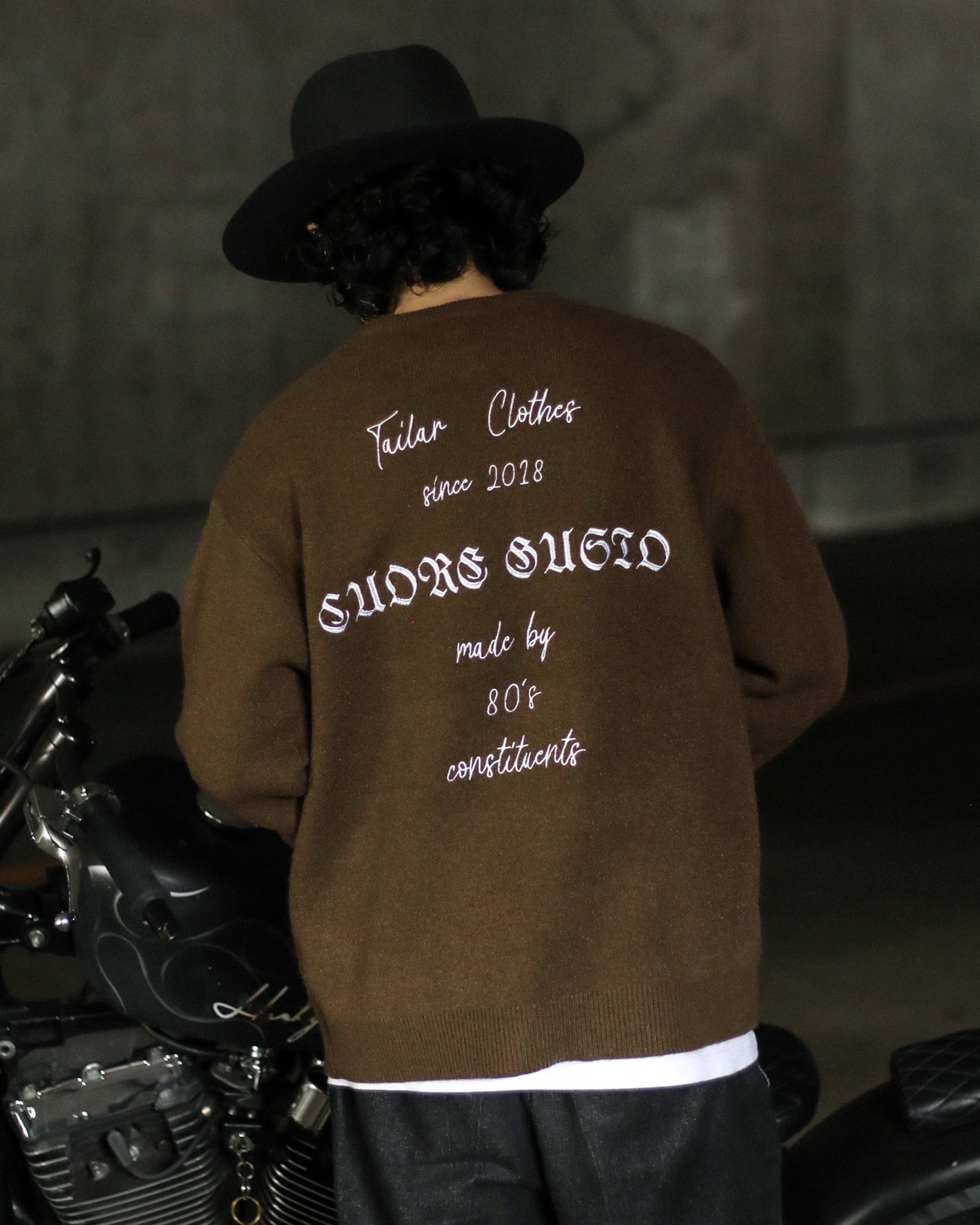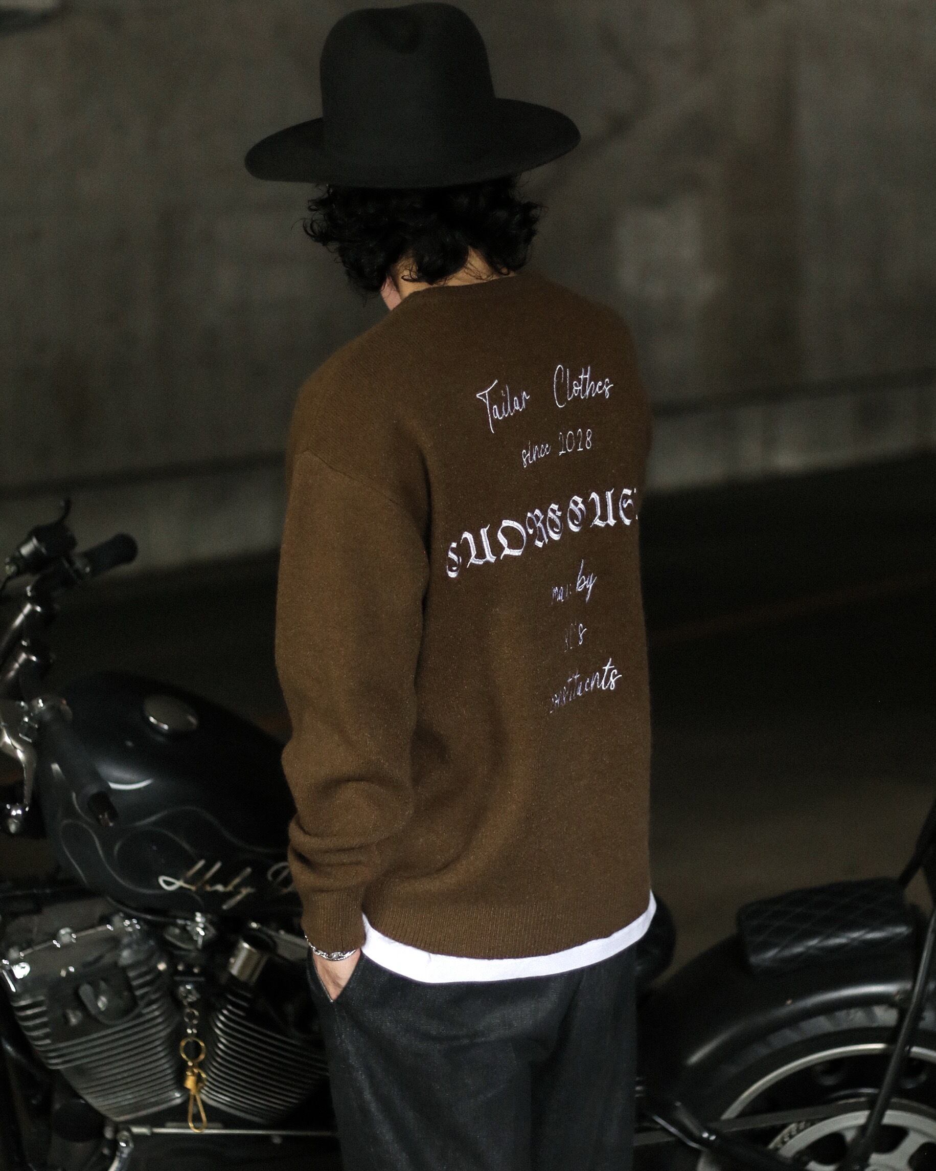 しかしこの一枚では、あえて凹凸のあるニットにメッセージ性のある刺繍グラフィックを配置。