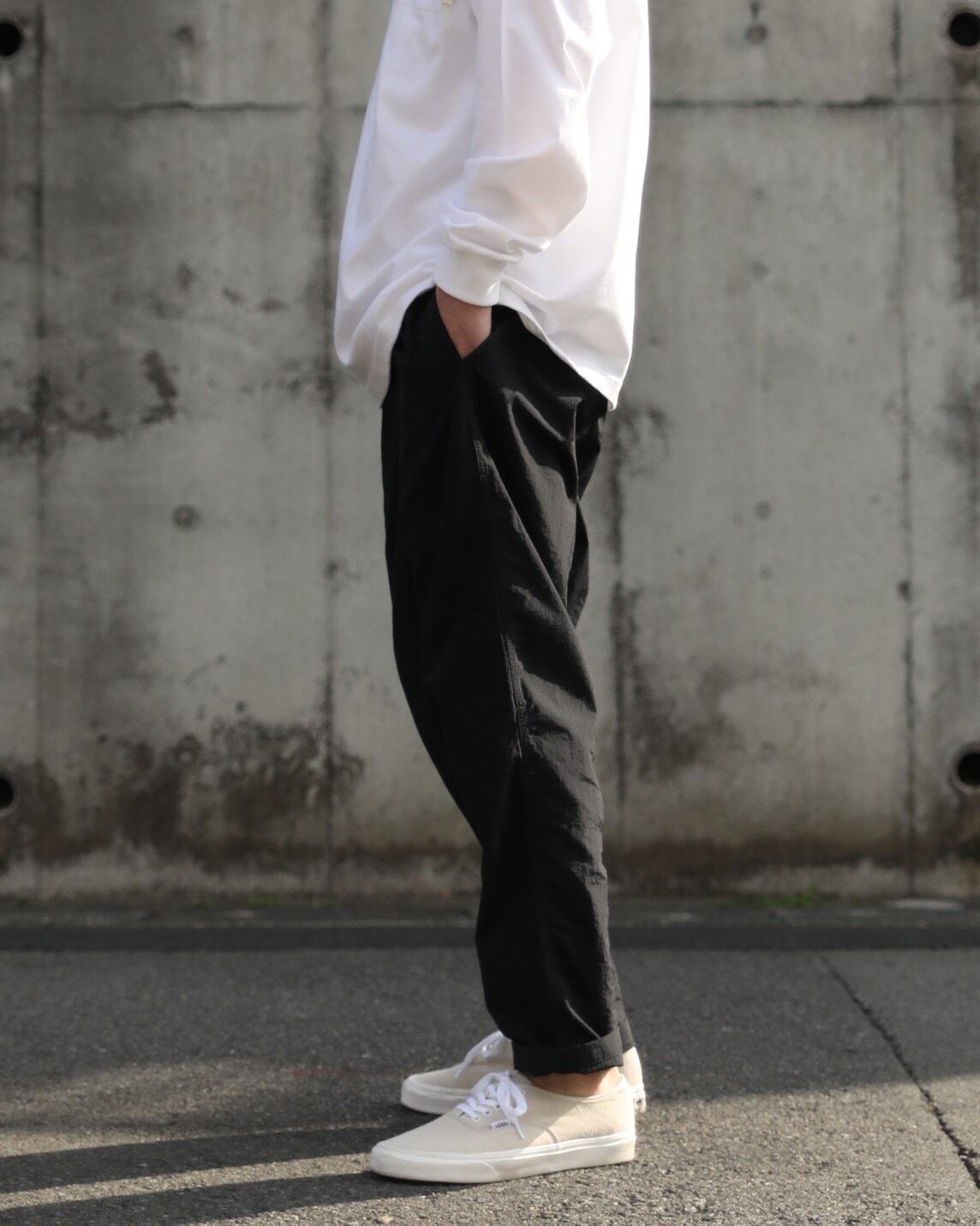 ・ヒップや腿周りに適度なゆとりを持たせ、膝から裾にかめて徐々に細くなるテーパードシルエット